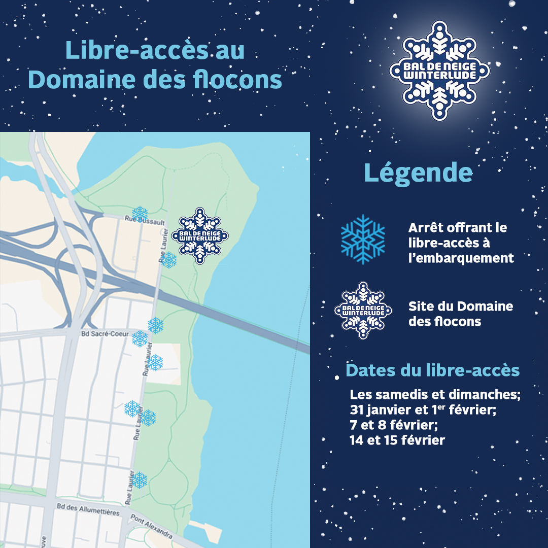 - Les déplacements effectués depuis ou vers le site du Domaine des flocons (parc Jacques-Cartier) seront sans frais.